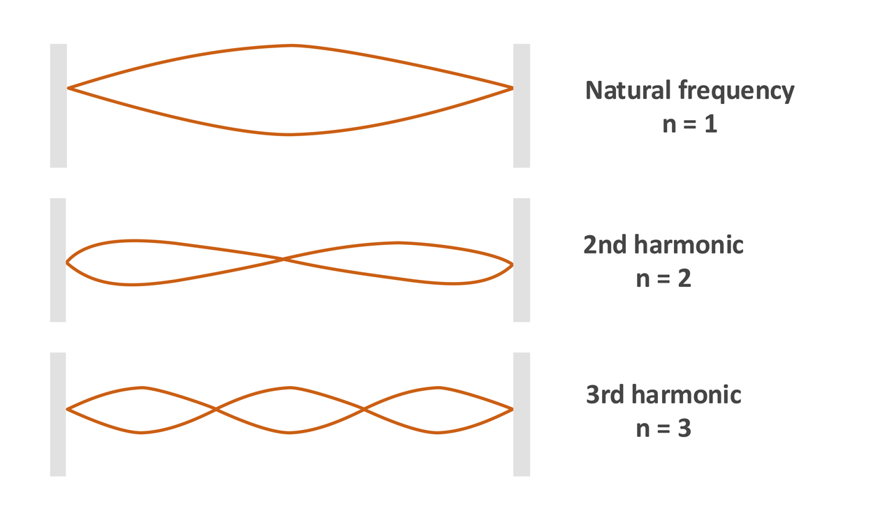 Resonant frequencies are called harmonics. The first harmonic corresponds to the natural frequency, the second harmonic is when there are two antinodes, the third when there are three and so on (see figure 2.13).